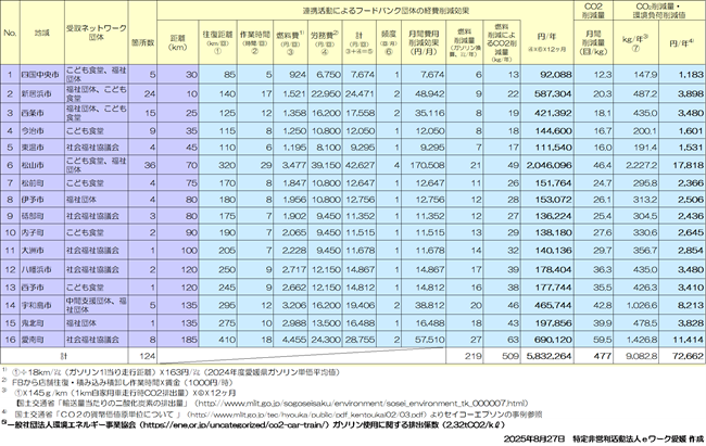 これまでの食料シェア団体・協力企業とのネットワークを活用したフードドライブ活動の連携により、食品引取り横持作業、運搬費用が年間約583万円削減、ガソリン換算燃料が年間約219リットル削減、CO2排出量が年間約9トン削減という推計値が確認できました。詳細は表2のとおりです。